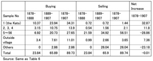 According to Table 7, the total transacted land during 1878–1907 was 85.7 hectares. The Kato family’s landholdings increased by 34.6 hectares and reduced by 1.3, implying a net increase of 33.2 hectares. The second-, third-, and fourth-largest property holders increased their landholdings in that period (net increase: 11.8 hectares). The landholdings of households other than the four largest property holders (52 households) increased by 23.4 hectares and reduced by 53.1, implying a net decrease of 29.7 hectares.