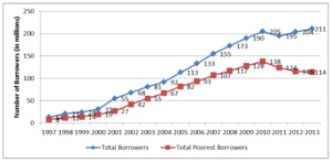 Figure 1 shows that, as at December 12, 2013, over 211 million poor clients had been reached globally with financial services by more than 3,700 MFIs, out of which over 54 percent were among the poorest clients (“Microfinance Summit Campaign Report” 2014). In terms of scale, the number of savers and borrowers, and the value of loan portfolios have increased exponentially. Between 2002 and 2007, a steady growth of 14 percent per annum was recorded in both the total number of borrowers and poorest borrowers. For the last five years, the total number of borrowers grew by 2 percent per annum while the number of poorest clients declined by the same margin (“Microfinance Summit Campaign Report” 2014). The peak outreach of MFIs occurred in 2010 after the global financial crisis of 2008. This suggests that the crisis had minimal adverse effects on the outreach goal of MFIs. Another view is that, the effects of the financial crisis have a time lag. In view of the burgeoning outreach of the MFI model, recent concerns are centred on client protection and the need for regulation.